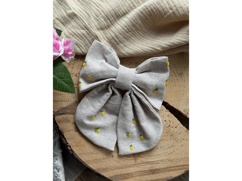 Vyšívaná mašle do vlasů s motivem citrónků